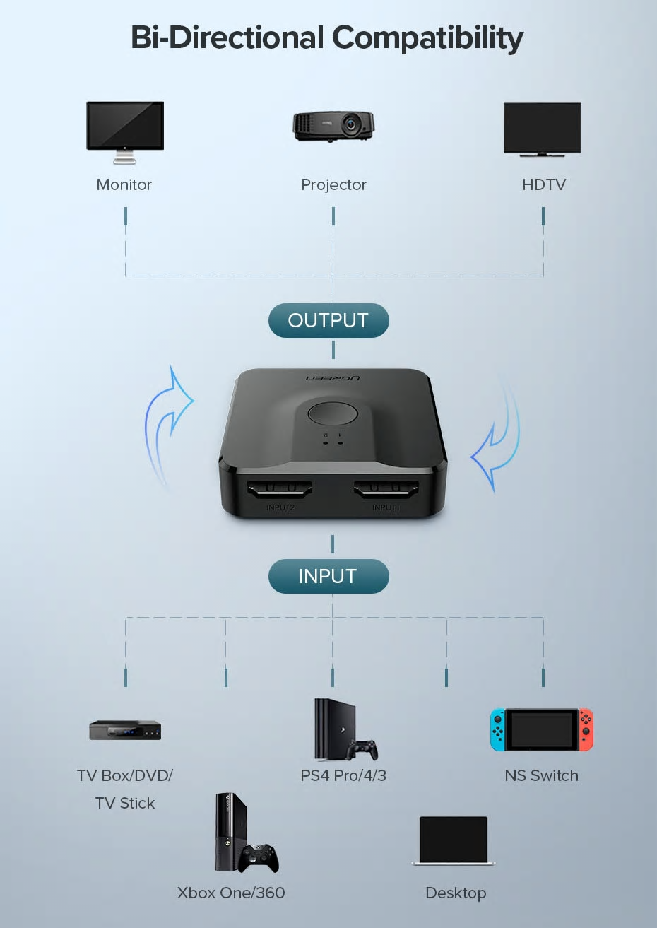 Ugreen HDMI 스위치는 양방향 작업을 수행 할 수 있습니다.2 개의 HDMI 소스를 하나의 HDMI 디스플레이에 연결하거나 하나의 HDMI 소스를 연결하여 두 개의 디스플레이 사이에 전환하십시오 (2 모니터는 동시에 표시 할 수 없습니다.)