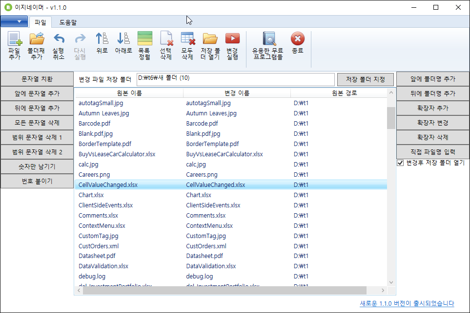 - 두가지 모드가 지원됩니다. 첫째 원본 파일은 보존되며 이름 변경된 파일들은 지정된 폴더로 저장되는 모드. 둘째 원본 이름을 직접 변경하는 모드.