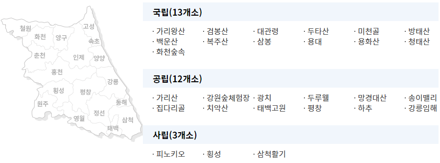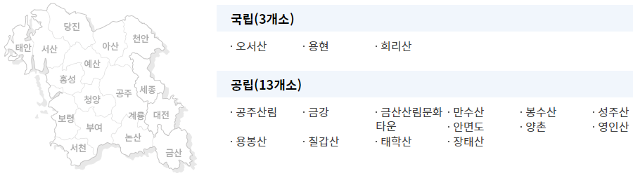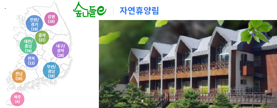 전국 162개소 자연휴양림을 살펴보면 아래와 같고, 상세 자연휴양림 소개는 각 자연휴양림 홈페이지를 참고하세요~