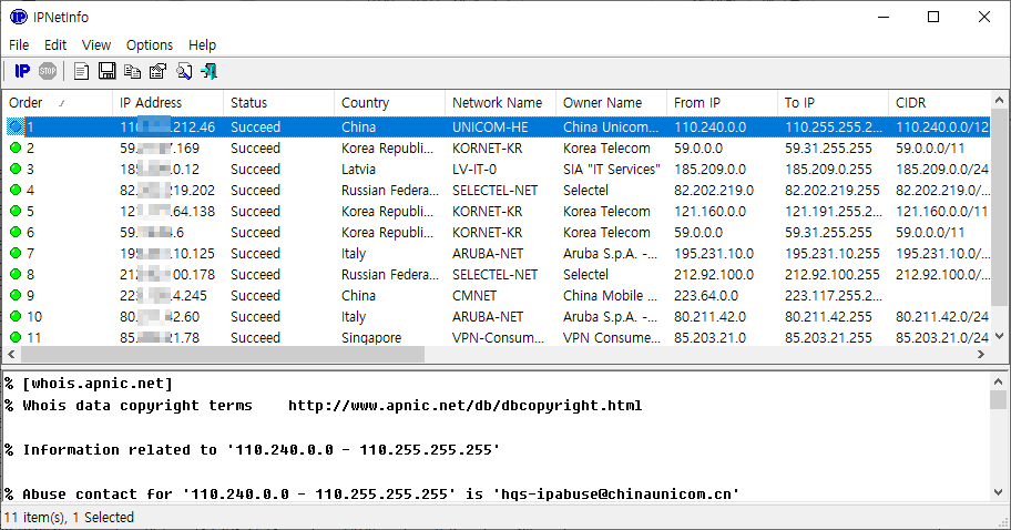 nirsoft에 있는 ipnetinfo 툴을 이용하시면 됩니다.