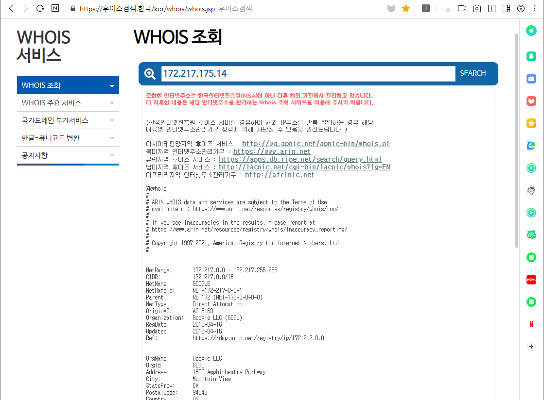 IP가 확인되면 키사의 후이즈 검색을 이용하여 국가 및 ISP(네트워크 제공 회사)를 조회하구요.