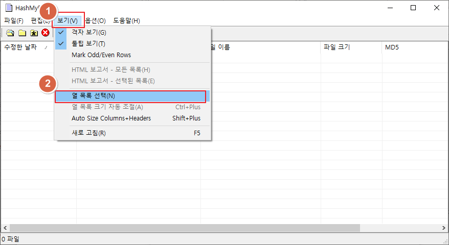 ○ 열 목록 설정: 메뉴 보기 > 열 목록 선택