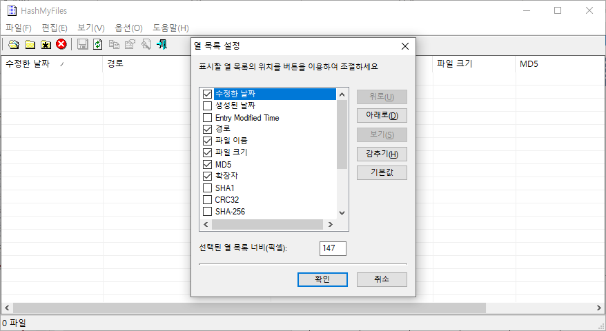 ○ 열 목록 설정: 수정한 날짜, 경로, 파일 이름, 파일 크기, MD5, 확장자 등 체크