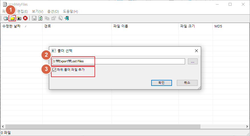 ○ 폴더 해시 구하기: 툴바 폴더 아이콘 선택 > 폴더 선택, 하위 폴더 파일 추가 체크 > 확인