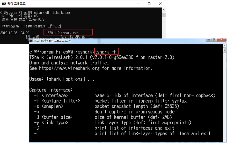 tshark의 도움말을 보기위해서는 cmd(명령 프롬프트)에 다음과 같이 입력합니다.