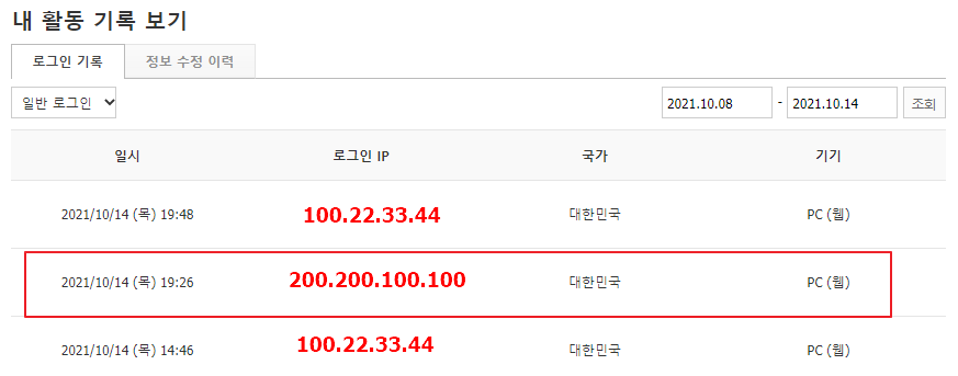 로그인, 비밀번호 변경, 연락처 수정 등 네이버 아이디의 주요 활동 기록을 확인할 수 있습니다.
