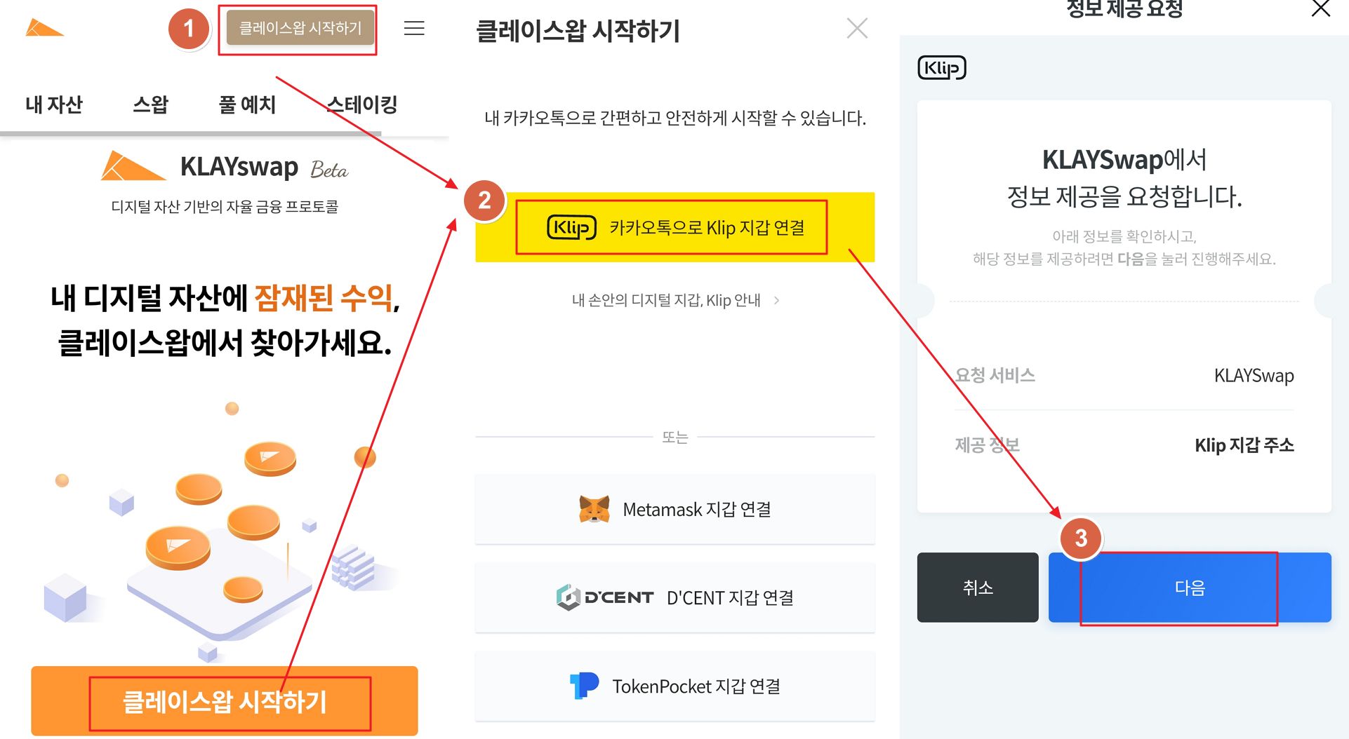 - 접속후 클레이스왑 시작하기 버튼으로 카카오톡의 klip 지갑 연결하여 로그인합니다.