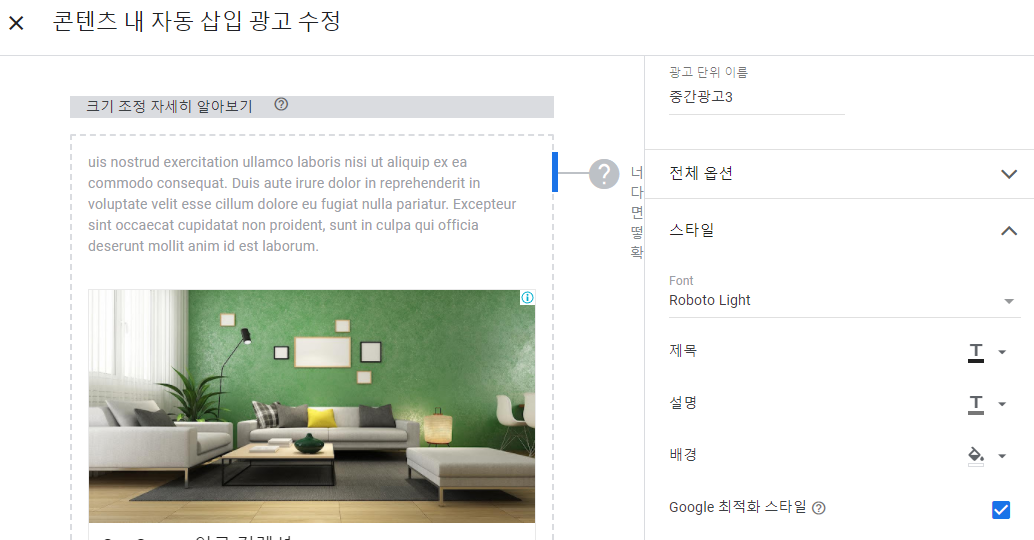 콘텐츠 내 자동 삽입 광고를 선택하면 아래와 같은 화면이 보이는데요,