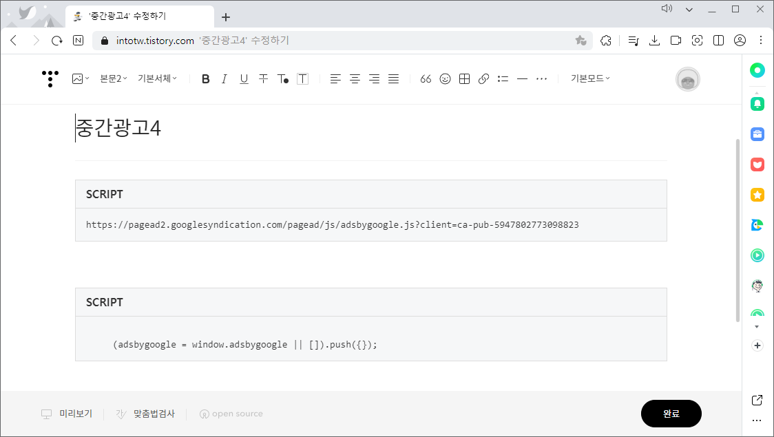 이제 넣을 광고 코드를 만들어 쓰니 티스토리에서 서식을 만들어 볼께요.