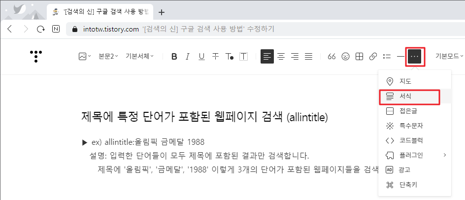 새 글을 작성하고, 광고를 넣을 장소에 '...' 메뉴를 선택해서 서식을 누룹니다.