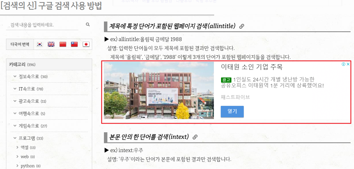 아래 사진은 게시글에 실제 서식을 이용한 광고가 적용된 스냅샷입니다.