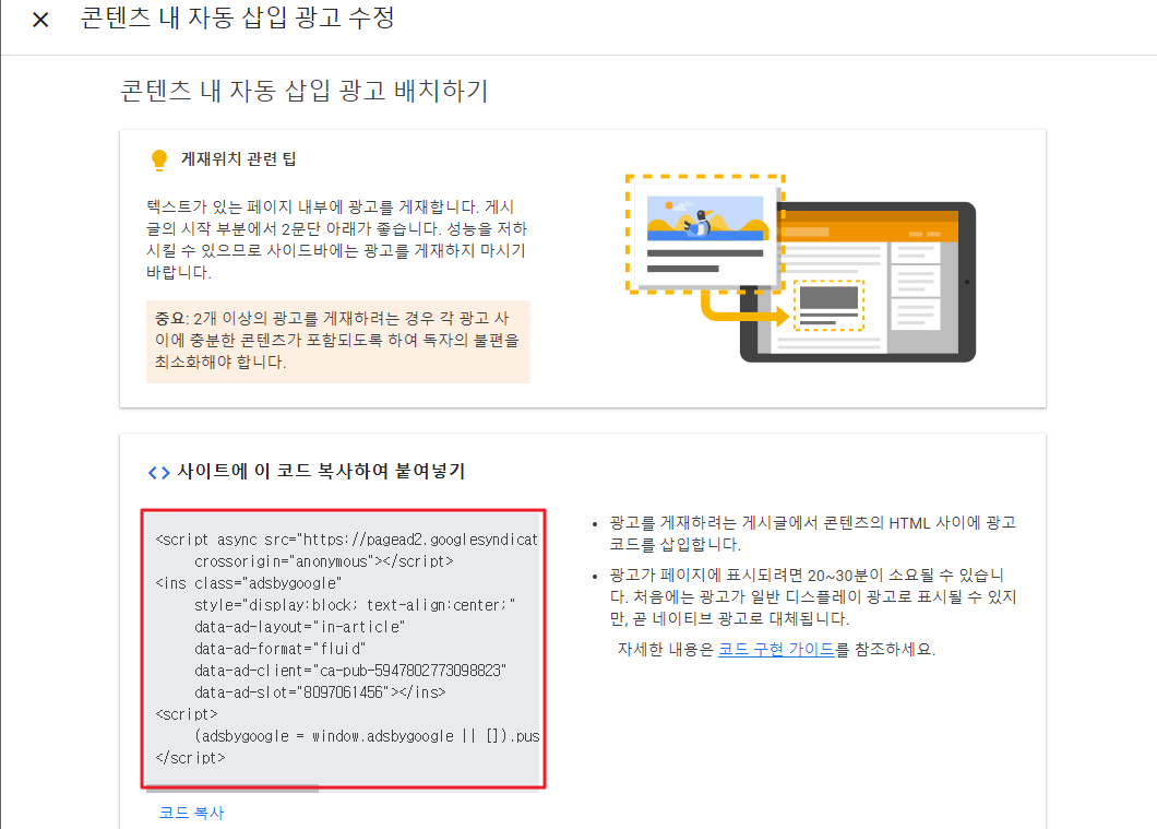 이렇게 광고 단위를 만들고 나서, 광고 코드를 복사합니다.