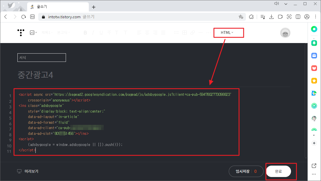 방금 복사한 애드센스 광고 HTML 코드를 서식으로 저장하고 포스팅 중에 불러와서 광고를 넣을 겁니다.