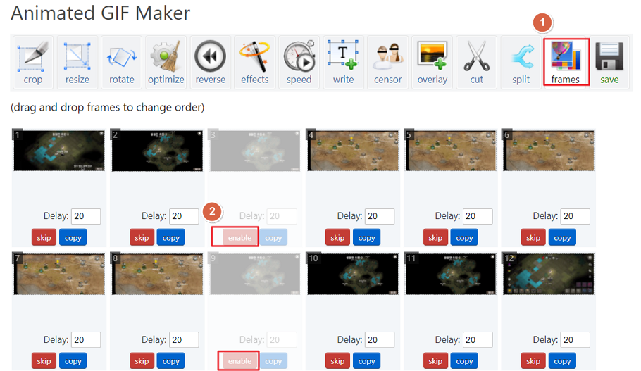 다른 옵션은 건들지 않고 frames 메뉴를 누르면 프레임 사진들이 나옵니다. 여기서 "skip" 버튼을 눌러서 빼 버리면 전체적인 용량과 필요없는 부분을 삭제할 수 있습니다.
