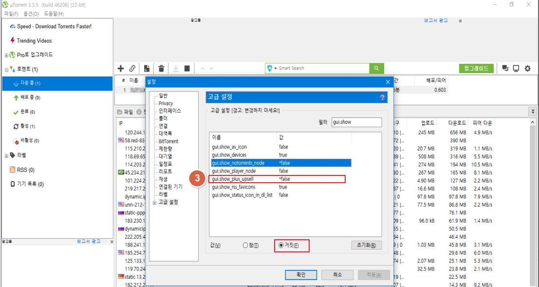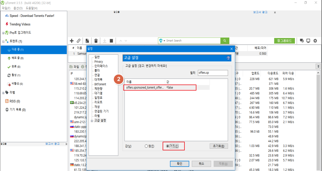 4. 필터에 offers.spon 검색한 후 "offers.sponsored_torrent_offer_enabled"가 나오면 "거짓(false)"으로 바꿔서 "상단 광고"를 제거합니다.