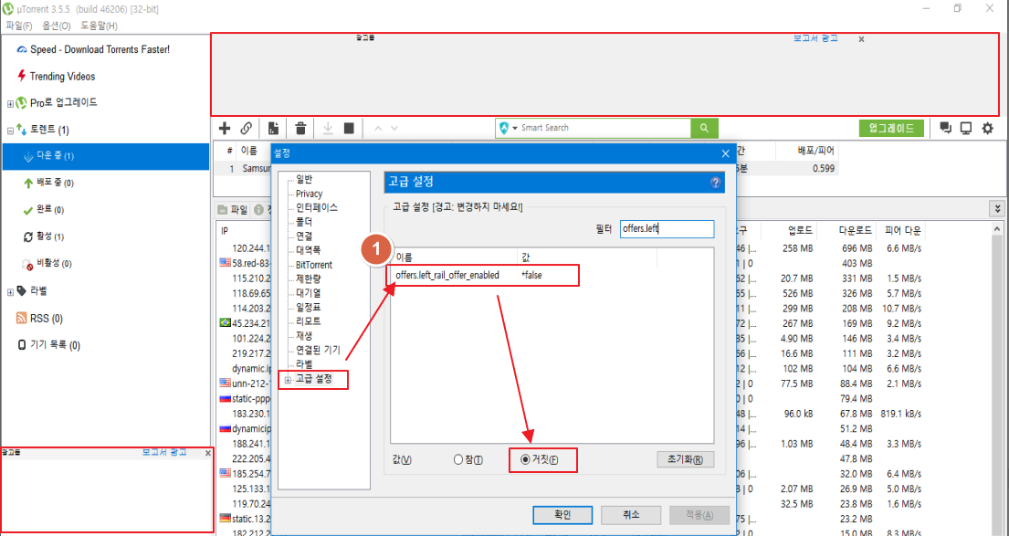- 상단 광고 제거: offers.sponsored_torrent_offer_enabled - false(거짓)