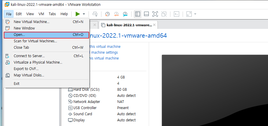 4. vmware File > Open > 압축해제한 디렉토리 선택 > 실행(Power on this virtual machine을 클릭)