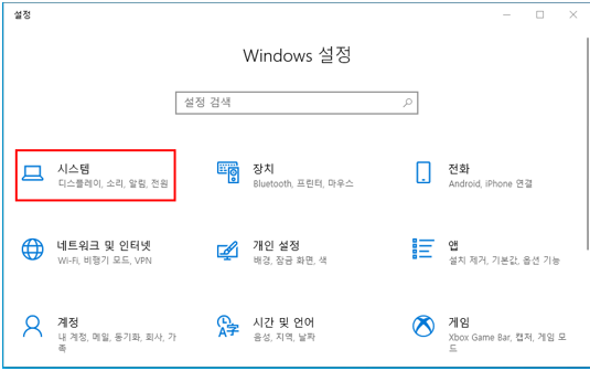 2. [시스템]을 선택하세요. ( 윈도우 > 시작 > 설정 > 시스템 )