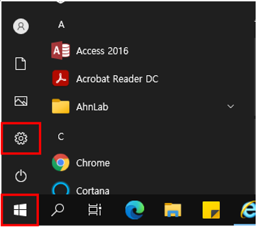 1. 바탕 화면의 작업표시줄에서 [시작] 버튼을 클릭 후 [설정]을 선택하세요.