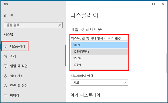 3. [디스플레이]에서 [배율 및 레이아웃]에서 원하는 텍스트 앱 및 기타 항목의 크기 변경 및 해상도로 변경하세요.