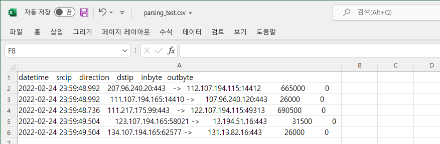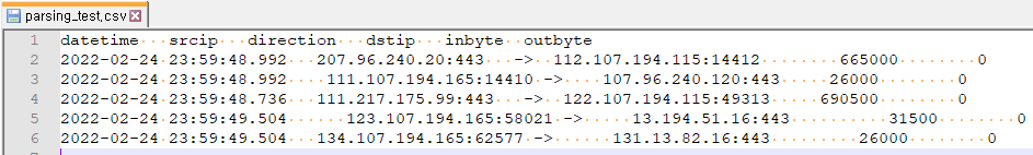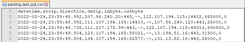 -parsing_test_out.txt 파일을 열어보면 일정하지 않은 스페이스로 된 데이터 파일이 아래와 같이 콤마(',') 분리자를 이용하여 잘 분리된 것을 확인할 수 있습니다.