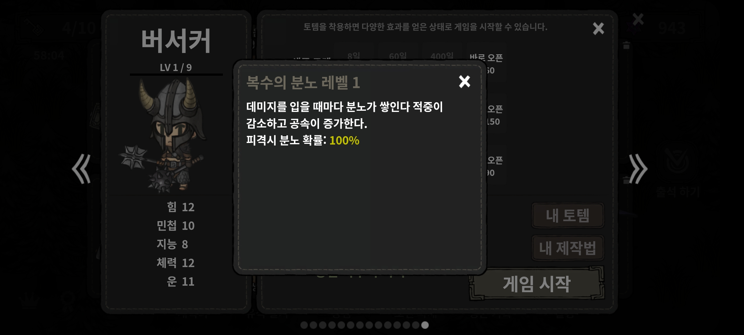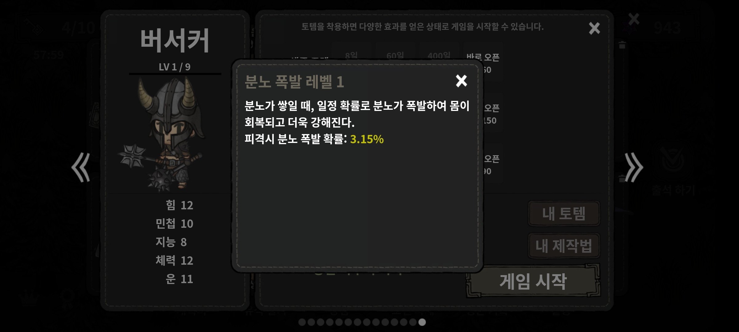 - 분노가 쌓일 때, 일정 확률로 분노가 폭발하여 몸이 회복되고 더욱 강해진다.
