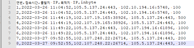 - 한 행에 4개(시간, srcip, dstip, inbyte)로 이루어진 데이타가 정상적으로 데이터베이스에 입력된것을 확인할 수 있습니다.