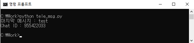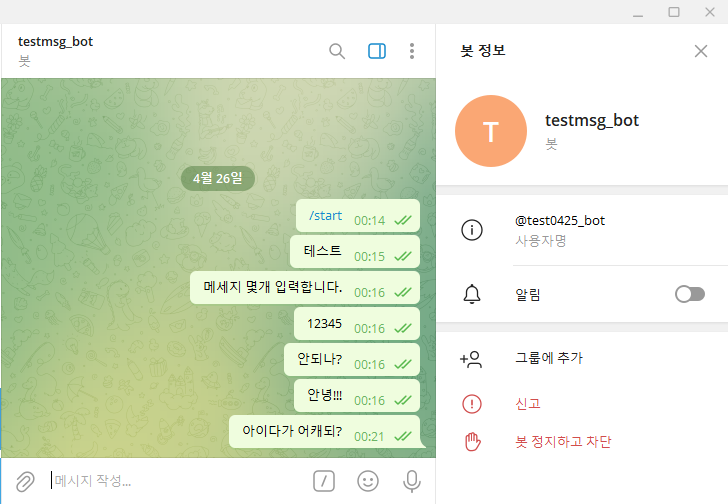 - 결과 값이 나오지 않아도 당황하지 마시고, 텔레그램 생성한 봇방에 메세지를 몇 번 입력하면서 실행하면 원하는 id값을 획득할 수 있습니다.