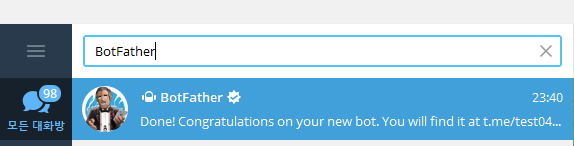 1. BotFather를 검색하고, 선택하여 방에 들어갑니다.