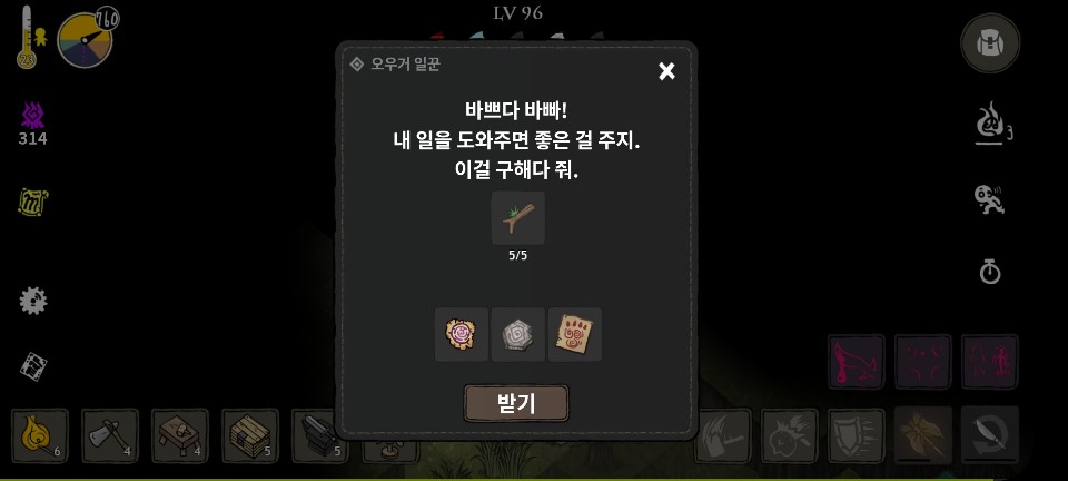 이때, 퀘스트 아이템으로 "바위 5, 밧줄 2, 나뭇가지5, 통나무5"을 챙겨가는 센스가 필요합니다.