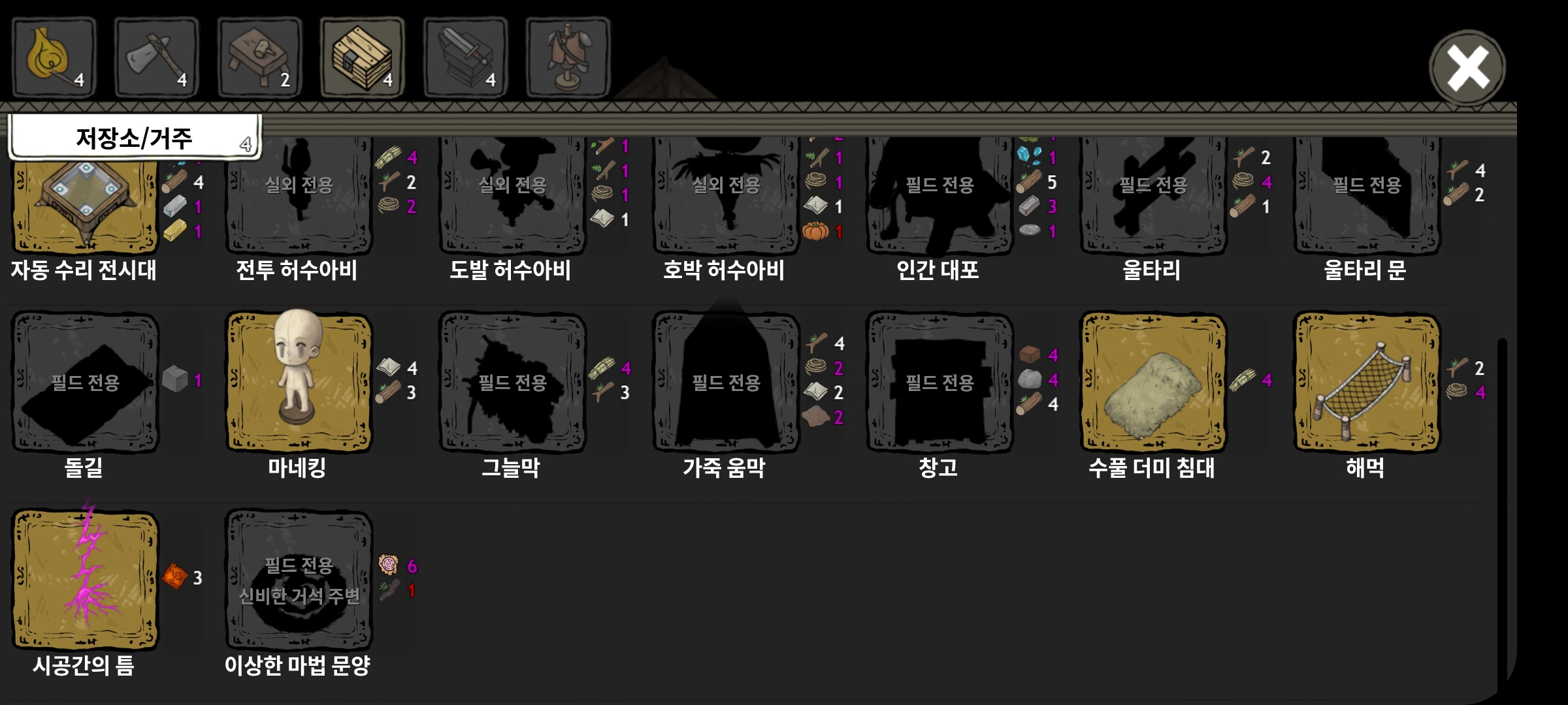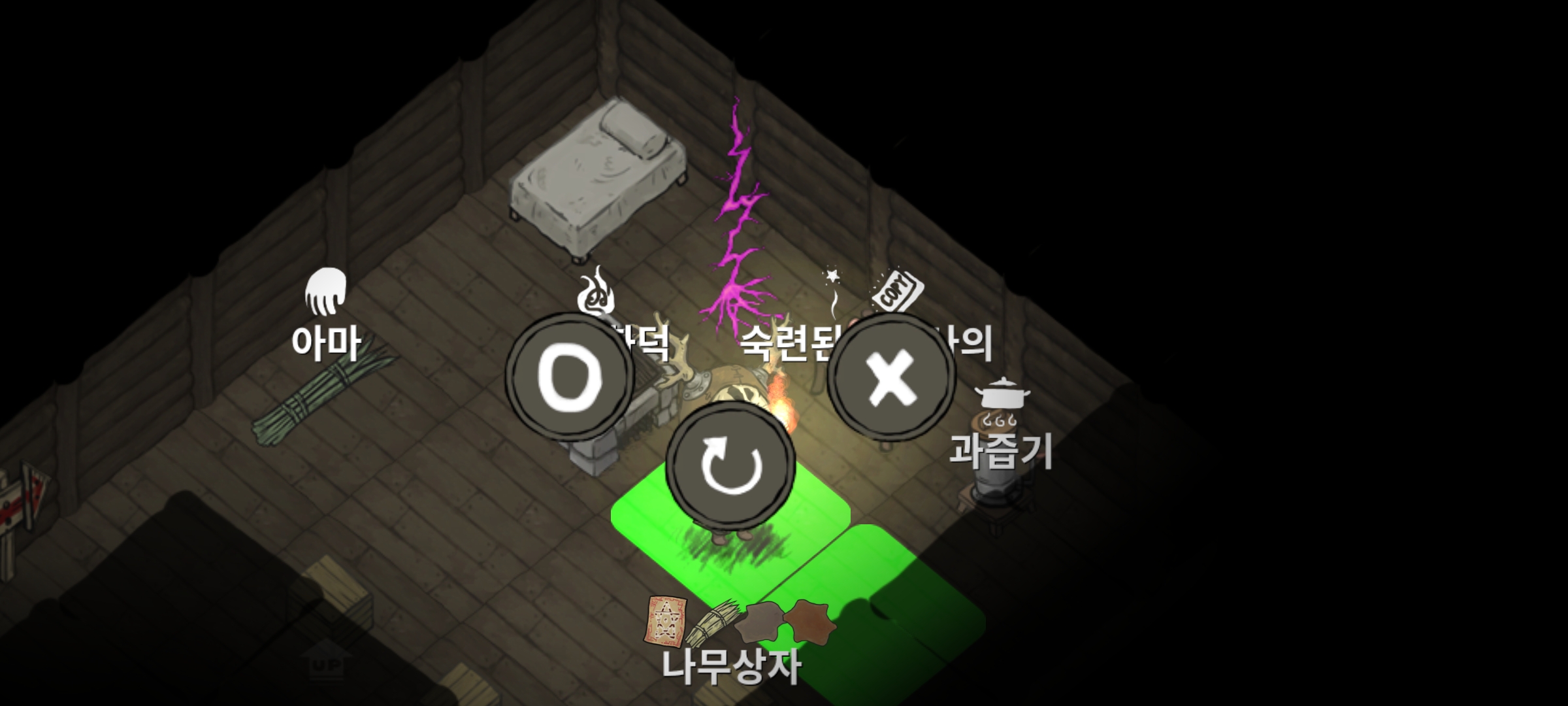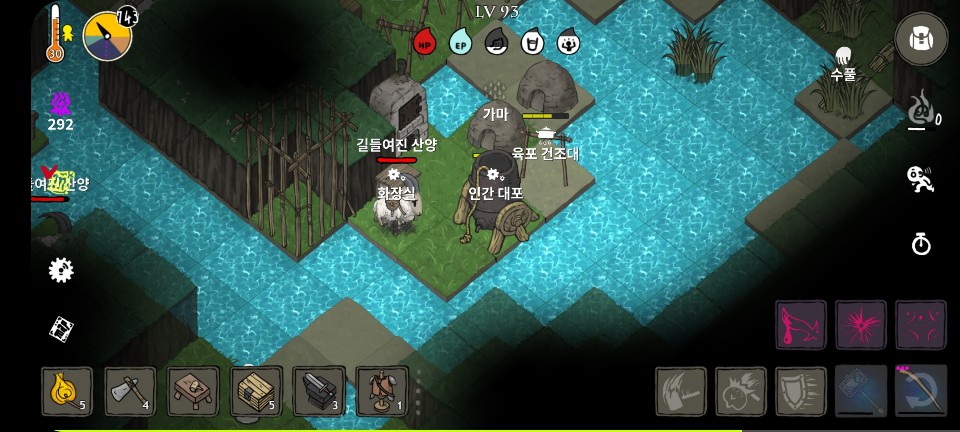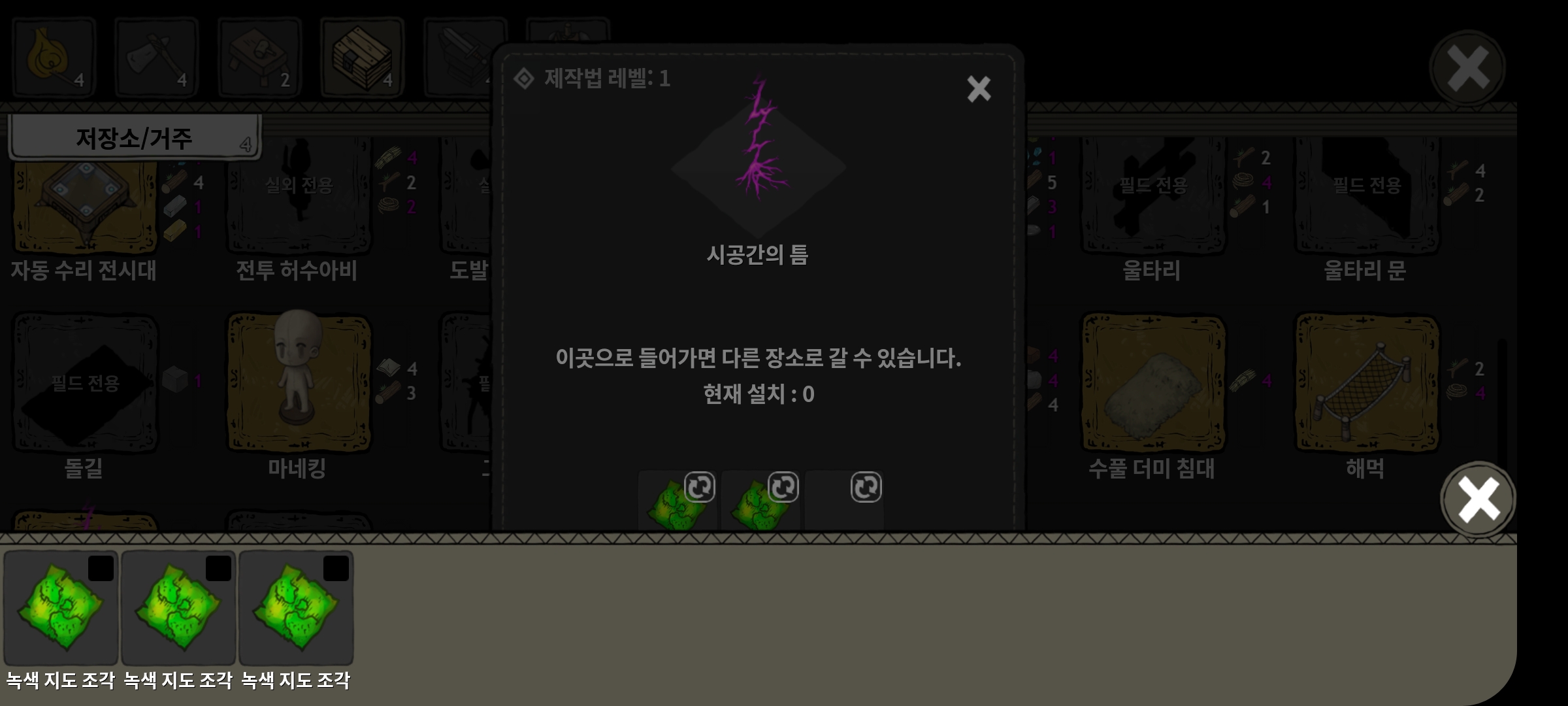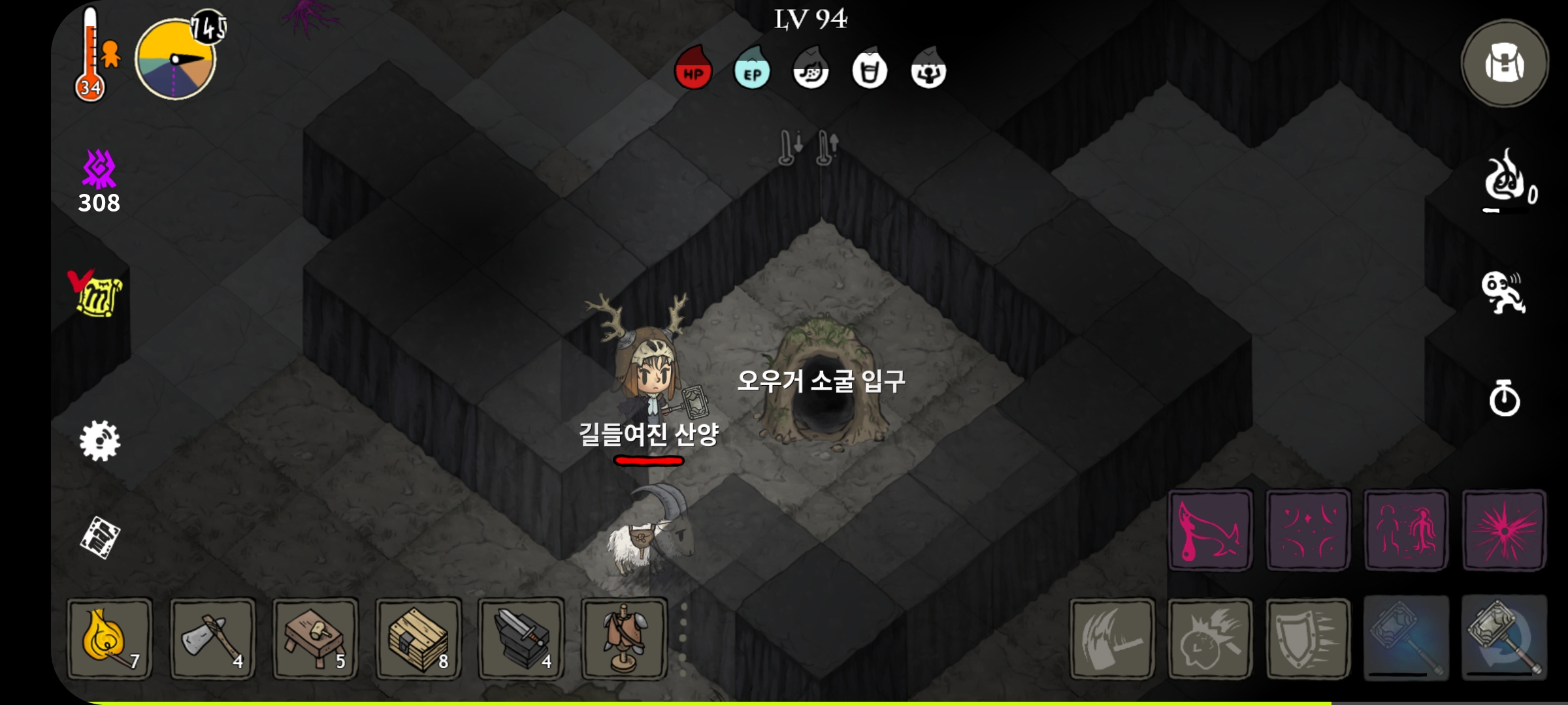 저장소/거주 메뉴에서 시공간의 틈을 만들어 낯선 땅(1-4) -> 오우거 소굴 이동합니다.