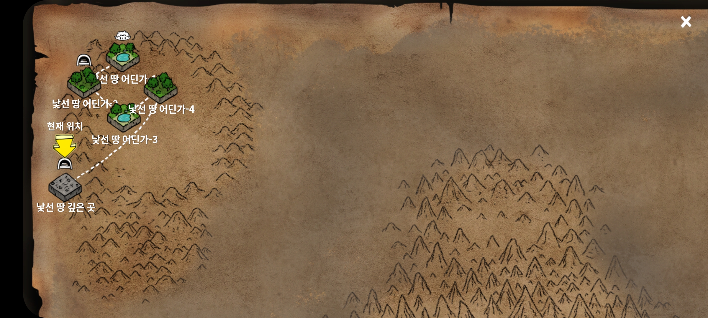 시공간의 틈에 들어가면 낯선 땅 어딘가-1 이며, 낯선 땅 1에서 4까지 이동 후, 낯선 땅 깊은 곳에 가면,