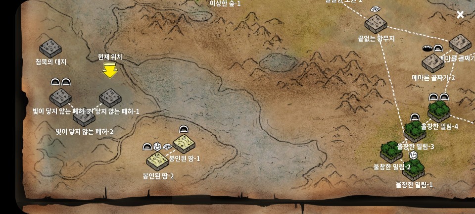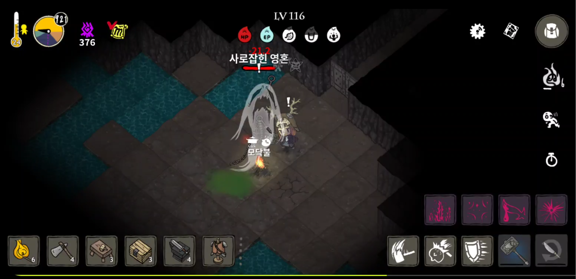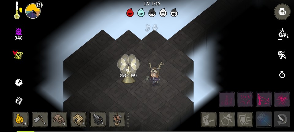 참고로 빛의 닿지 않은 페허는 귀환이 되지 않습니다. 나오는 방법은 몹들을 사냥하거나 광물, 수풀을 베거나하여 '작은 영