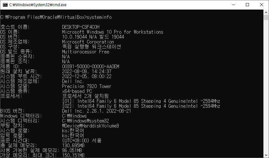 윈도우 cmd 콘솔에서는 systeminfo 명령어로 시스템 정보와 설치 OS의 버전 정보를 볼 수 있습니다.