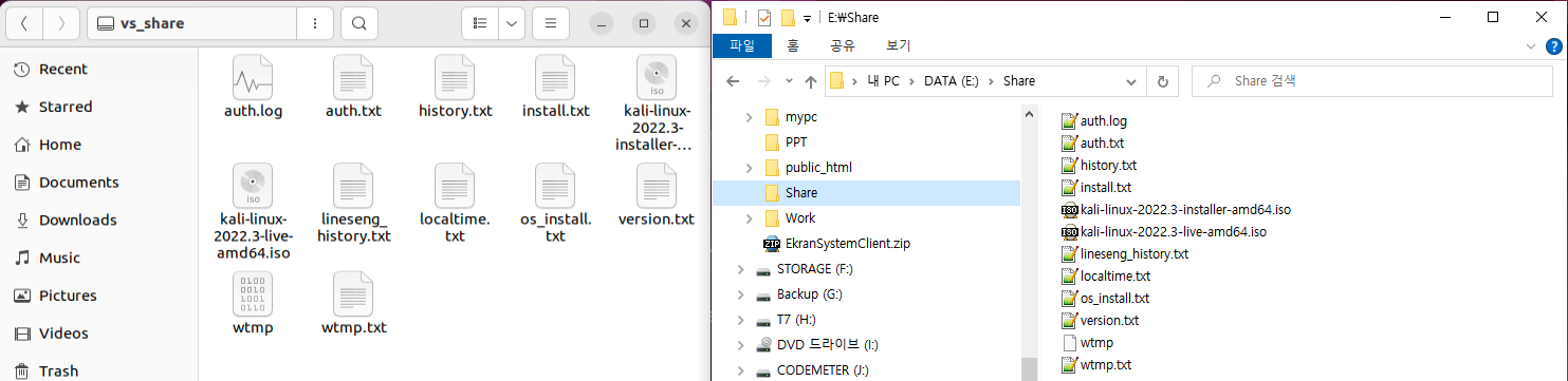 아래와 같이 리눅스 vs_share 폴더와 윈도우 Share 폴더가 공유된것을 알 수 있습니다.