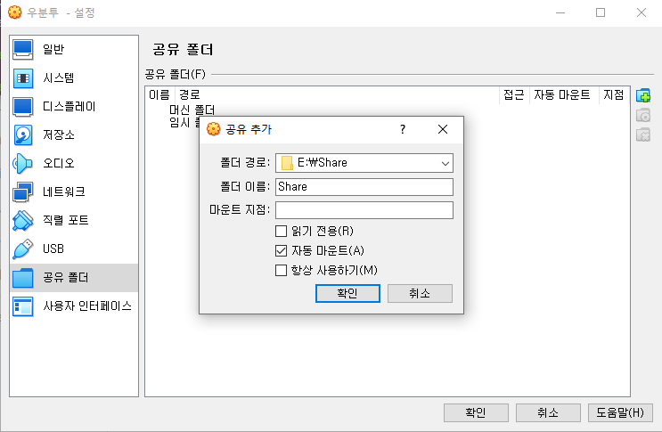 여기서 공유 폴더를 선택해주고, 자동마운트를 체크하고 확인 버튼을 눌러줍니다.