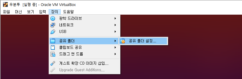 우선 VirtualBox 메뉴의 '장치 / 공유 폴더 / 공유 폴더 설정' 메뉴를 선택합니다.
