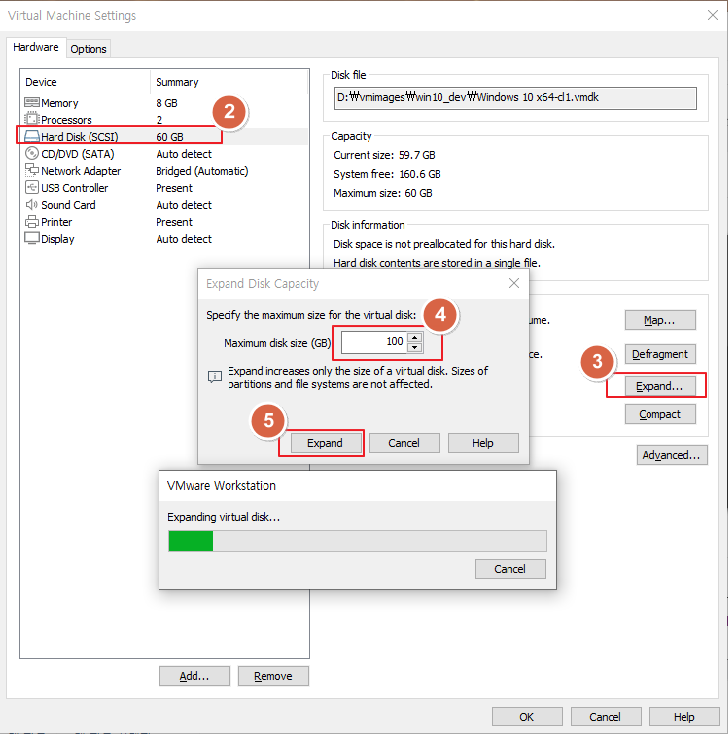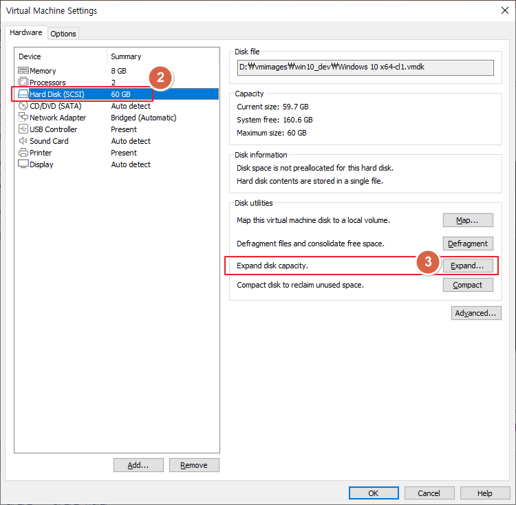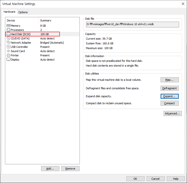 하드웨어에서 Hard Disk 을 선택후, Expand 버튼을 눌러서 하드 디스크 용량 늘리기를 시도합니다.