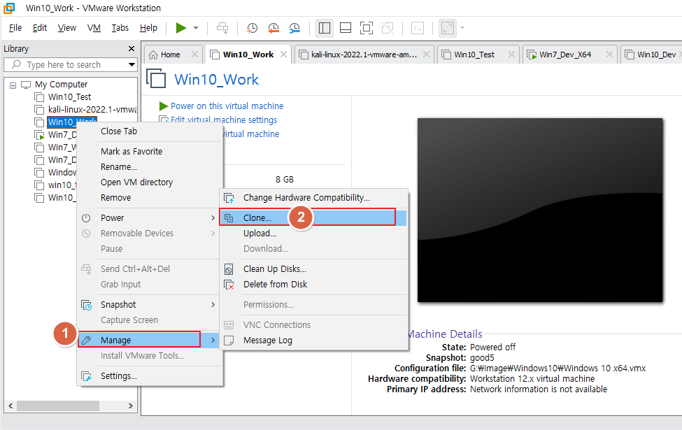 VMWare 메뉴 > VM > Manage > Clone