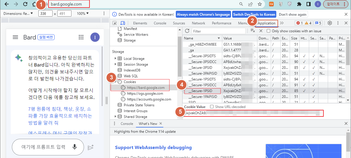 3. 개발자도구 메뉴에서 Application → Cookies → https://bard.google.com 선택