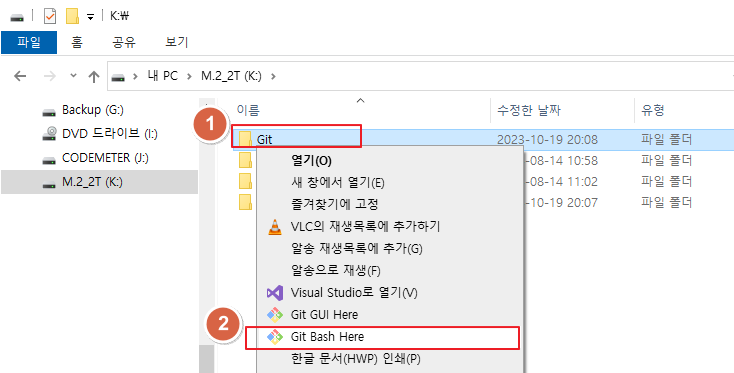 이후 탐색기로 해당 위치에서 마우스 오른쪽을 눌러서 "Git Bash Here" 메뉴를 눌러서