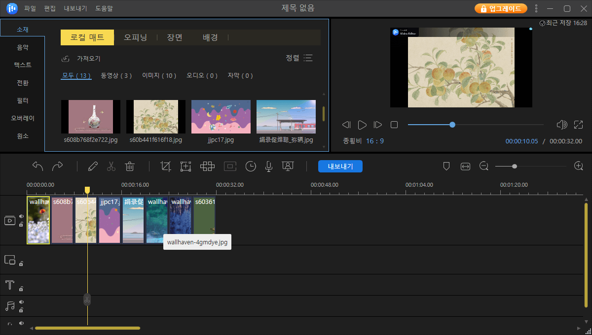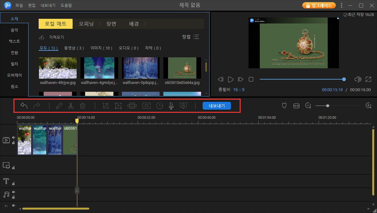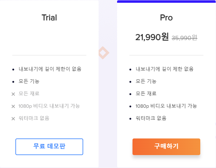 무료버전에 워터마크는 없지만, 1080p 비디오 내보내기, 모든 재료 등을 사용할 수 없습니다.