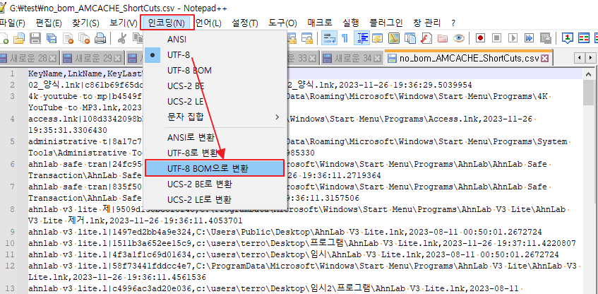 2. notepad++ 인코딩 메뉴에서 UTF-8 인코딩인것을 확인하고, 아래쪽에 있는 UTF-8 BOM으로 변환 메뉴를 선택하여 변경하시면 됩니다.