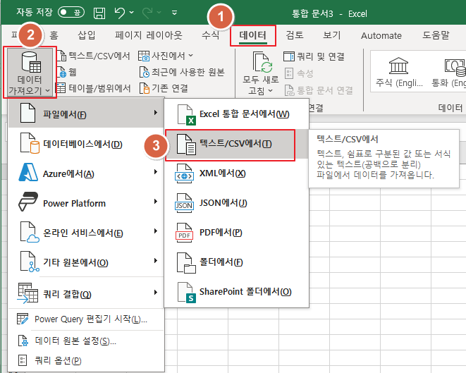 - 엑셀에서 파일을 열 때, 데이터를 올바른 인코딩으로 해석하도록 지정하는 방법입니다.