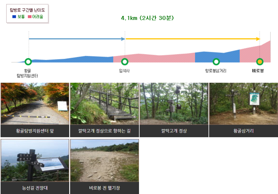 ▶ 황골 비로봉 코스: 황골 탐방 지원센터→입석사 →깔딱고개 → 항로불삼거리 →쥐너미재 전망대 → 비로봉 거치는 탐방코스( 편도 4.1km, 2시간30분 소요, 왕복 5시간) <<< 비로봉 가는 최단 코스
