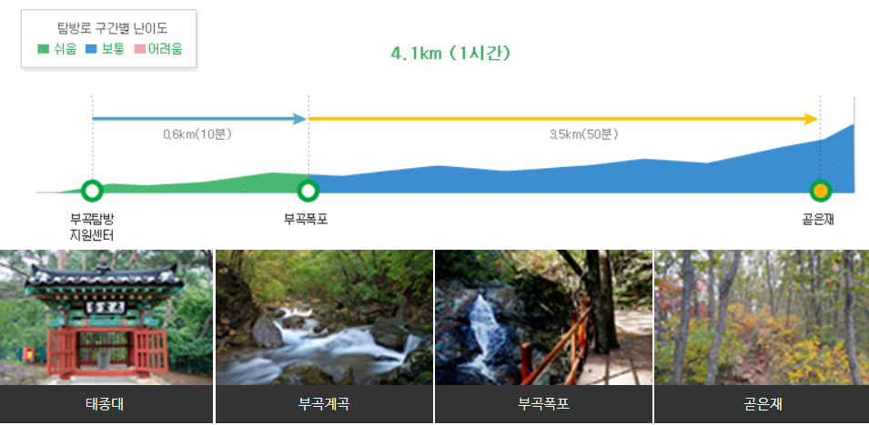 ▶ 부곡 곧은재 코스: 부곡탐방 지원센터→부곡폭포→곧은재 탐방 지원센터를 거치는 탐방코스( 4.1km, 1시간 소요)