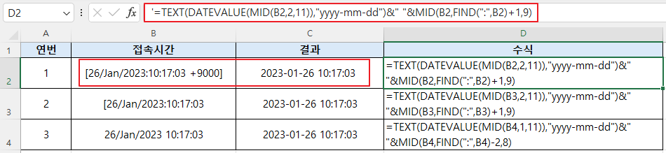 다음은 이를 위한 수식입니다. 예를 들어, 셀 B2에 [26/Jan/2023:10:17:03 값이 있다고 가정하겠습니다.