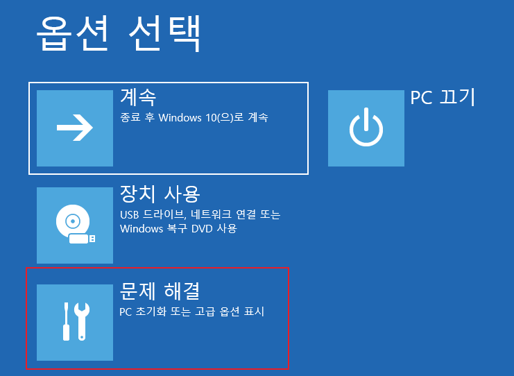 2. 옵션 선택(Choose an option) > 문제해결 (Troubleshoot) 메뉴 선택