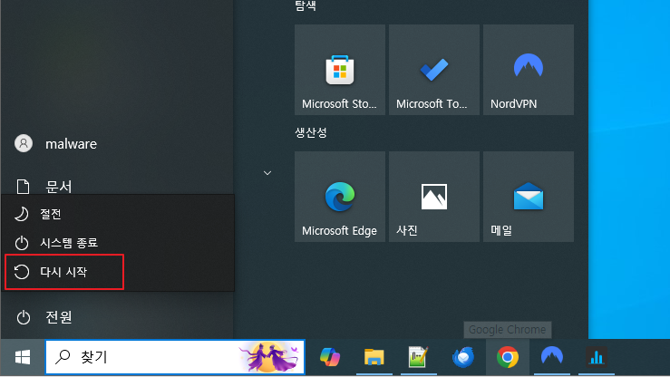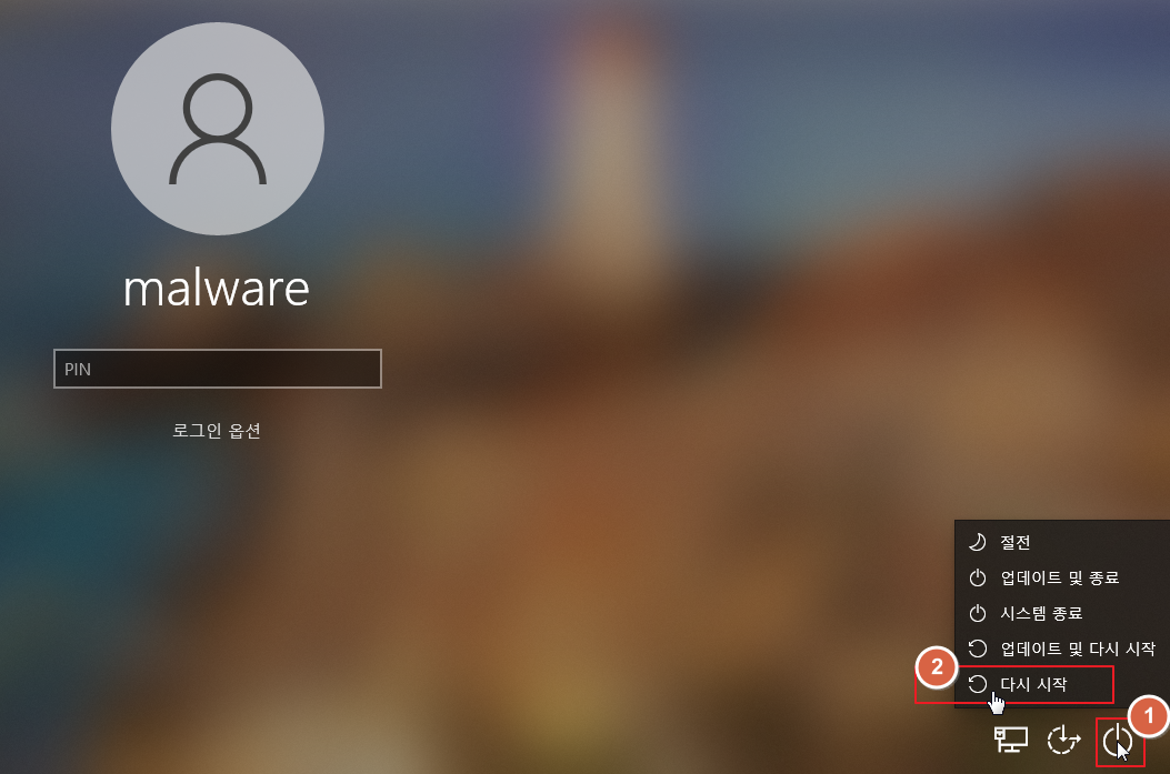 1. Shift 키 + '다시 시작' 버튼을 누릅니다.