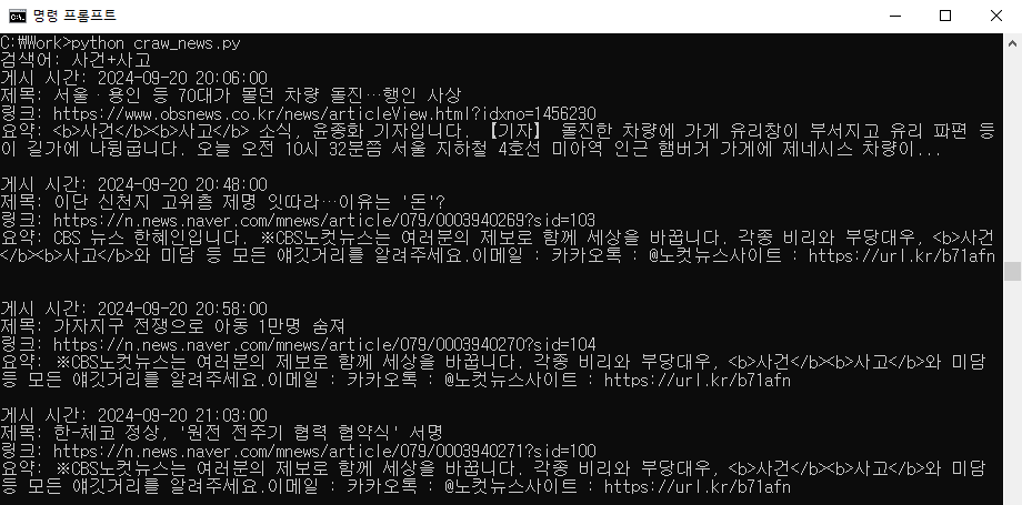 네이버API를 사용한 네이버뉴스 검색(검색어: '사건+사고')을 실행한 결과입니다.